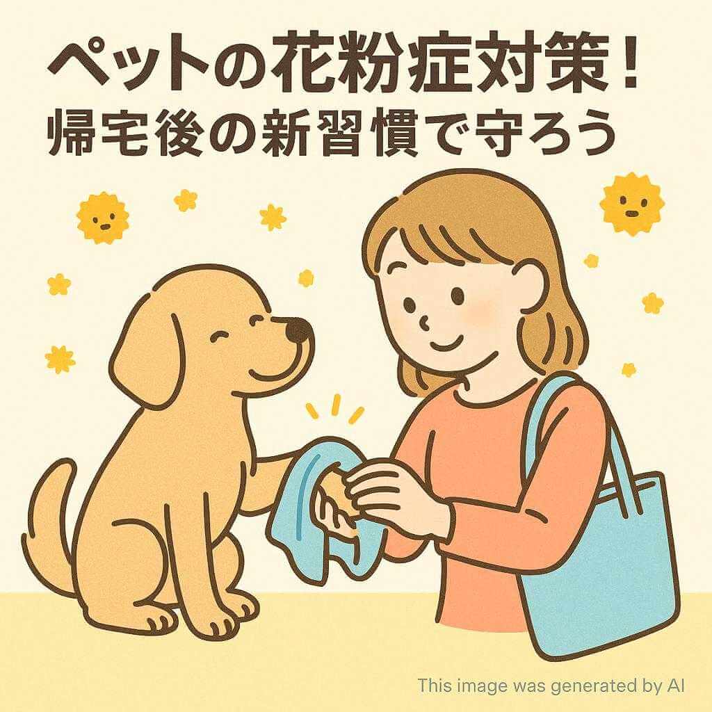 A2: 散歩後には、ペットの体に付着した花粉を取り除くために、濡れたタオルで体を拭くことをお勧めします。特に足裏や顔周りは念入りに拭いてあげると良いでしょう。また、ブラッシングも効果的です。